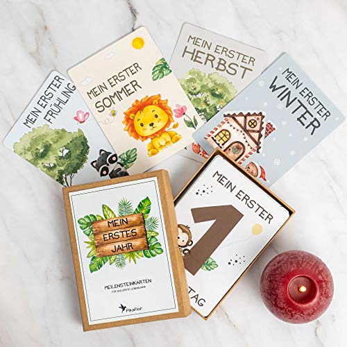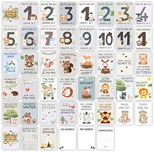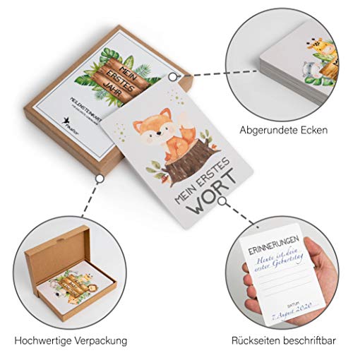 Specification: 45 Baby Meilensteinkarten Pikaflor für Junge und Mädchen (handgemalte Tiere, Deutsch) Meilenstein Karten Set mit Geschenkbox + Schöne Geschenkidee zur Geburt, Taufe & Babyparty