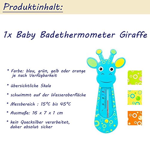 1 Baby Badethermometer Giraffe (Farbe: Blau, Gelb, Grün o. Orange) 15cm